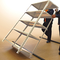 工場内で使うコンテナや台車各種、メッシュパレット、踏み台や区分棚等